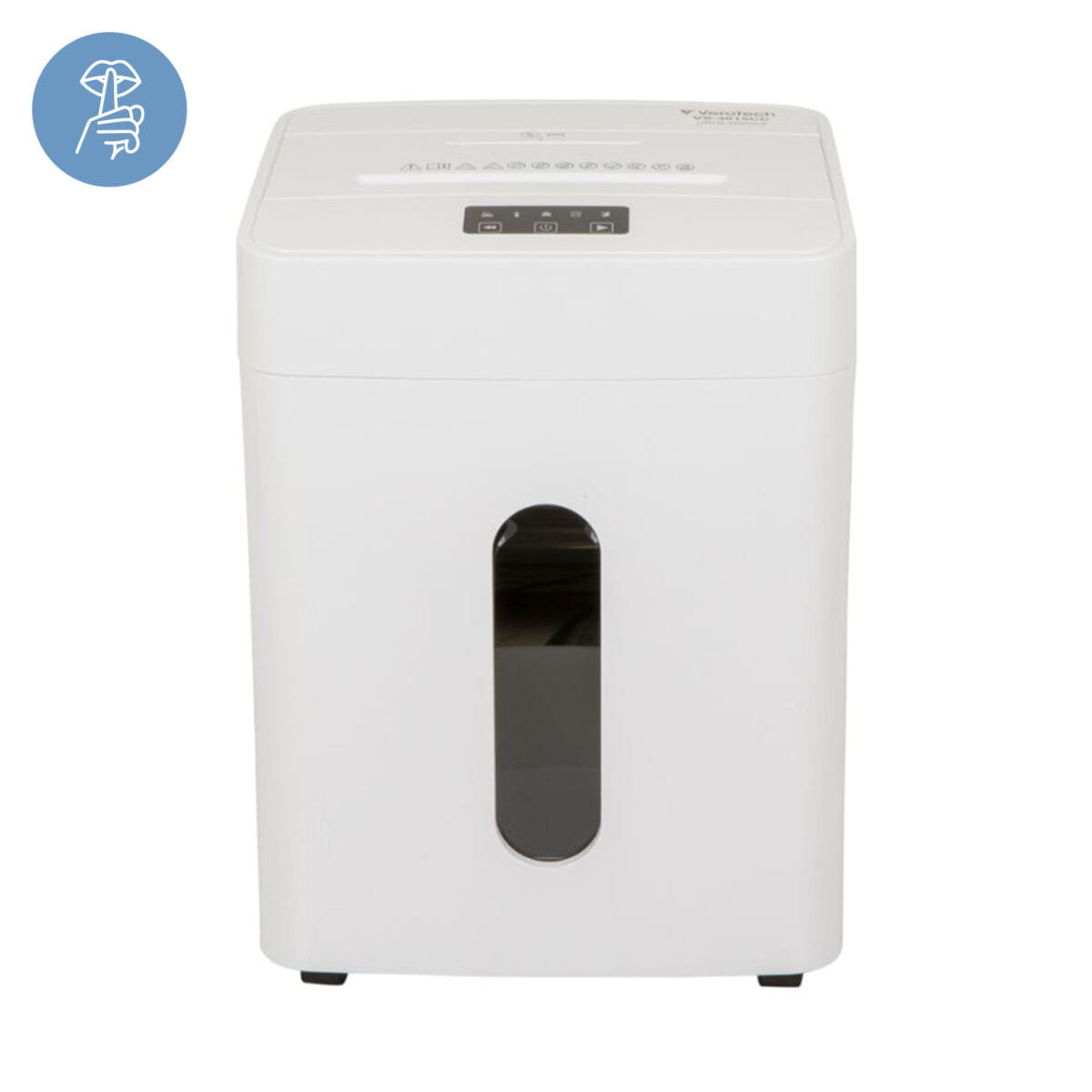 Niszczarka Verotech VS‑3015CC posiada kosz o pojemności 26 l z przezroczystym frontem, ułatwiającym kontrolę zapełnienia. Cicha praca (~40 dB) sprawia, że urządzenie doskonale sprawdzi się nawet w miejscach wymagających niskiego poziomu hałasu.