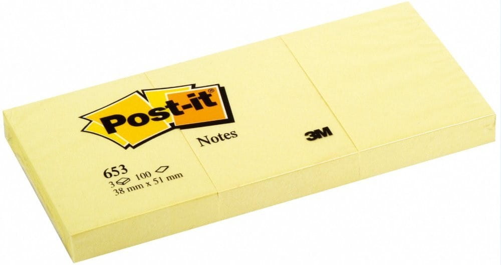 653 Bloczki samoprzylepne Post-it , - zólte, - 3 bloczki po 100 kartek, 38x51 mm - jednostka sprzedazy 1 opakowanie