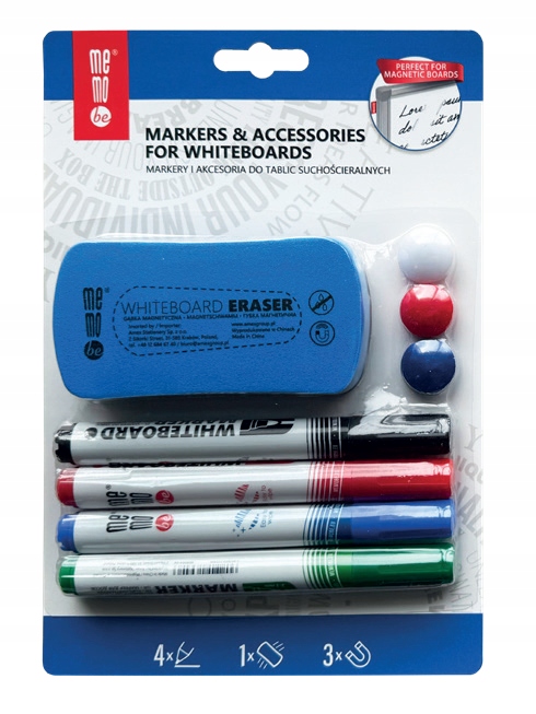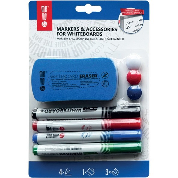 - Suchościeralne markery MemoBe (czarny, czerwony, niebieski i zielony) przeznaczone do tablic o powierzchniach lakierowanych, ceramicznych i szklanych