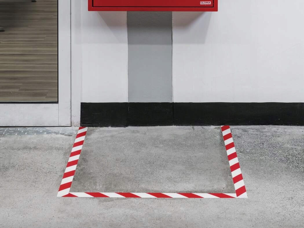 Samoprzylepna czerwono-biala taśma Duraline Strong bardzo wytrzymala do oznakowania wewnątrz budynków.
